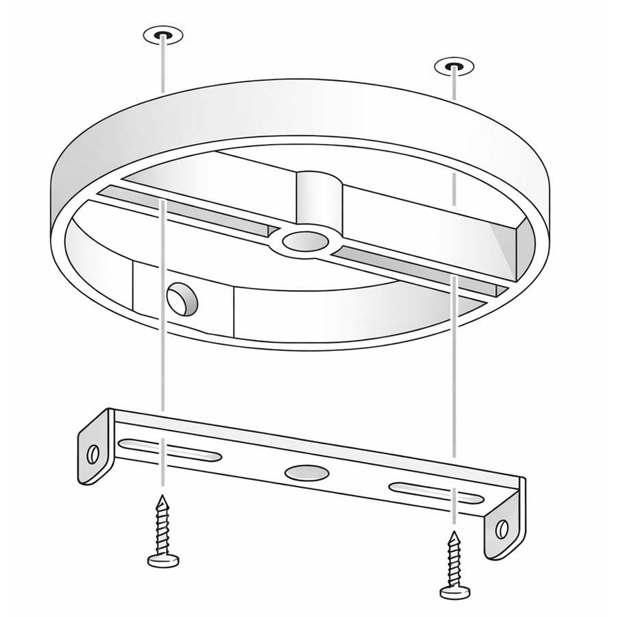 Genau aus dieser Alltagssituation heraus ist die Idee für einen runden Montage-Adapterring entstanden. Er wird zwischen Decke und Montagebügel der Leuchte geschraubt. Der Adapter ermöglicht es, das Anschlusskabel seitlich in die Leuchte zu führen, ohne es zu quetschen.